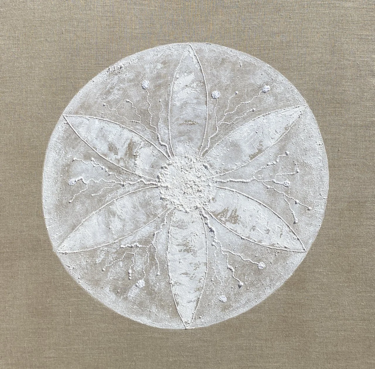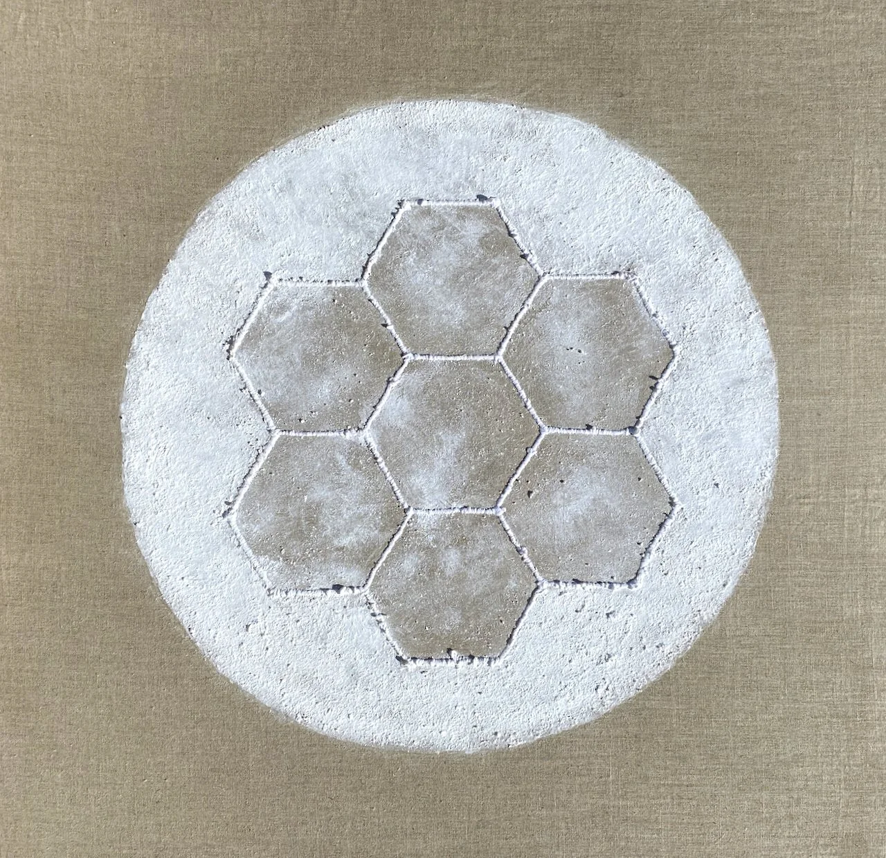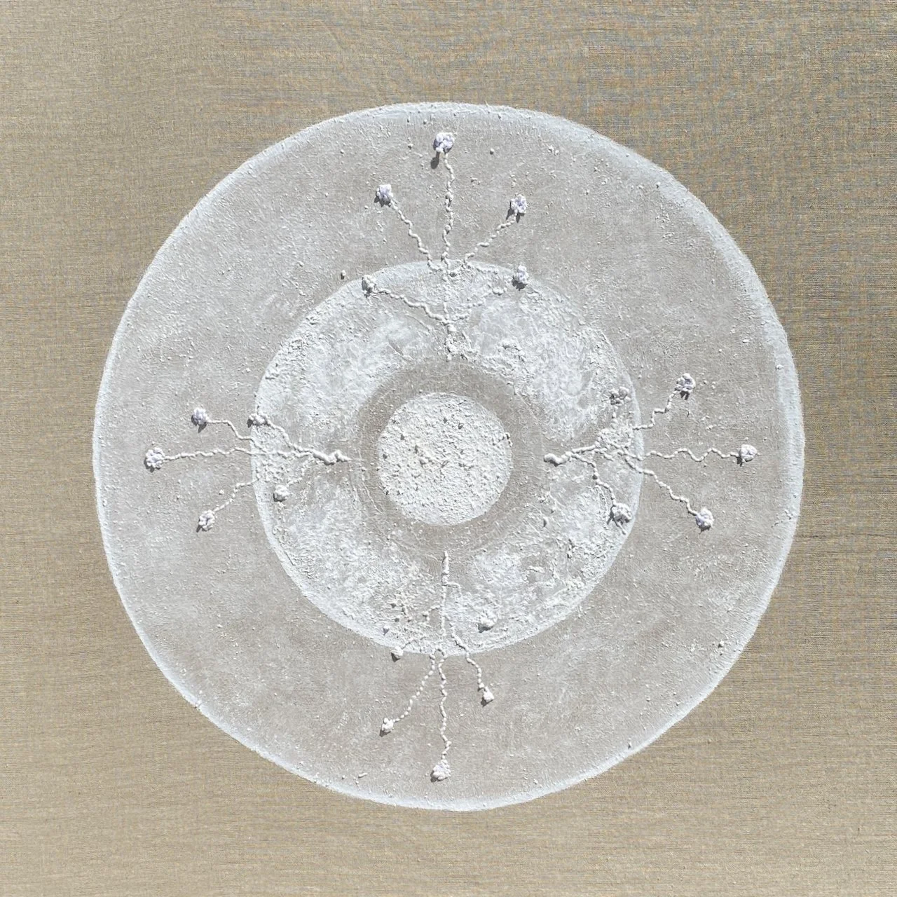 Marble dust & embroidery with yarn on raw linen, 110×110cm.