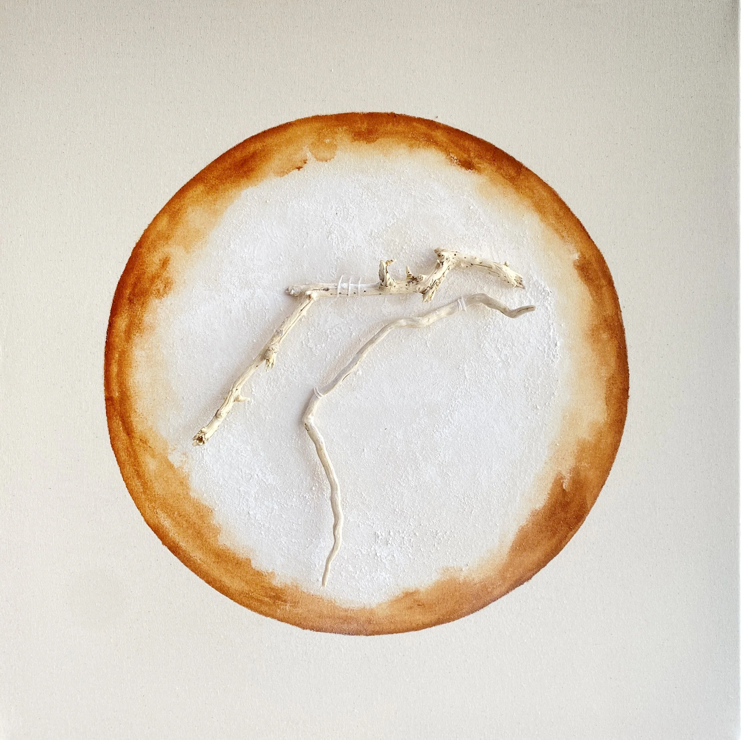 Earth, driftwood & marble dust on canvas, 60×60cm.